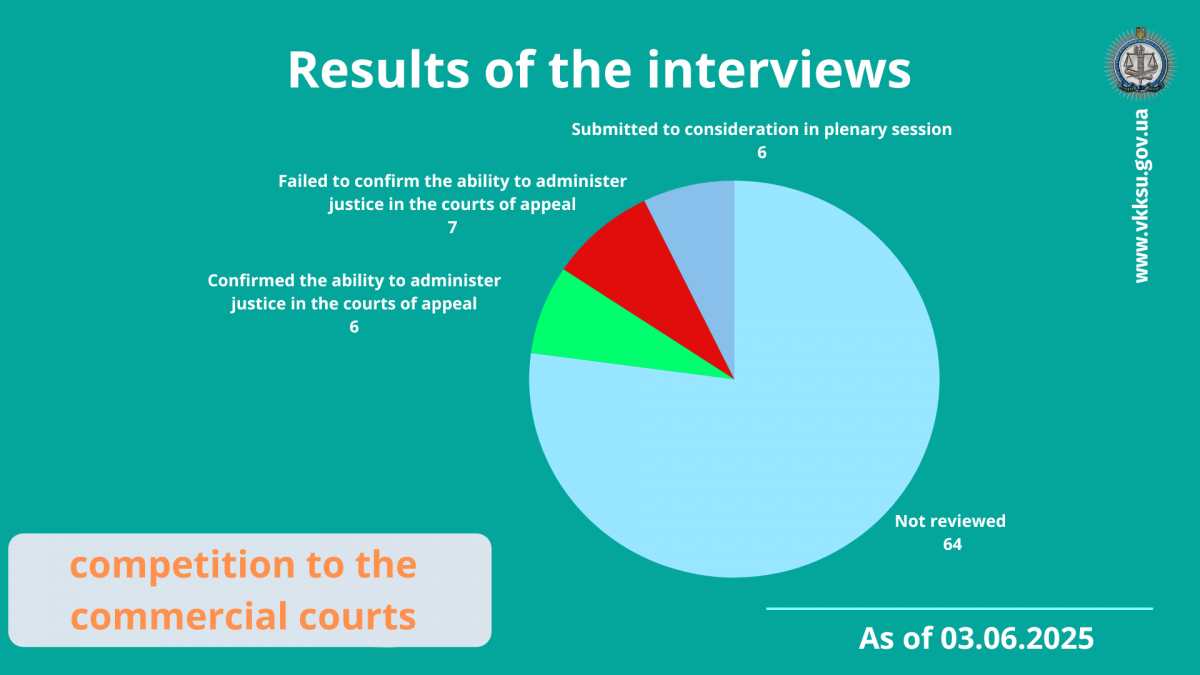 On June 03, 2025, the Second Chamber of the High Qualification Commission of Judges of Ukraine held interviews and determined the results of the qualification evaluation of five candidates for the positions of judges of commercial courts of appeal.