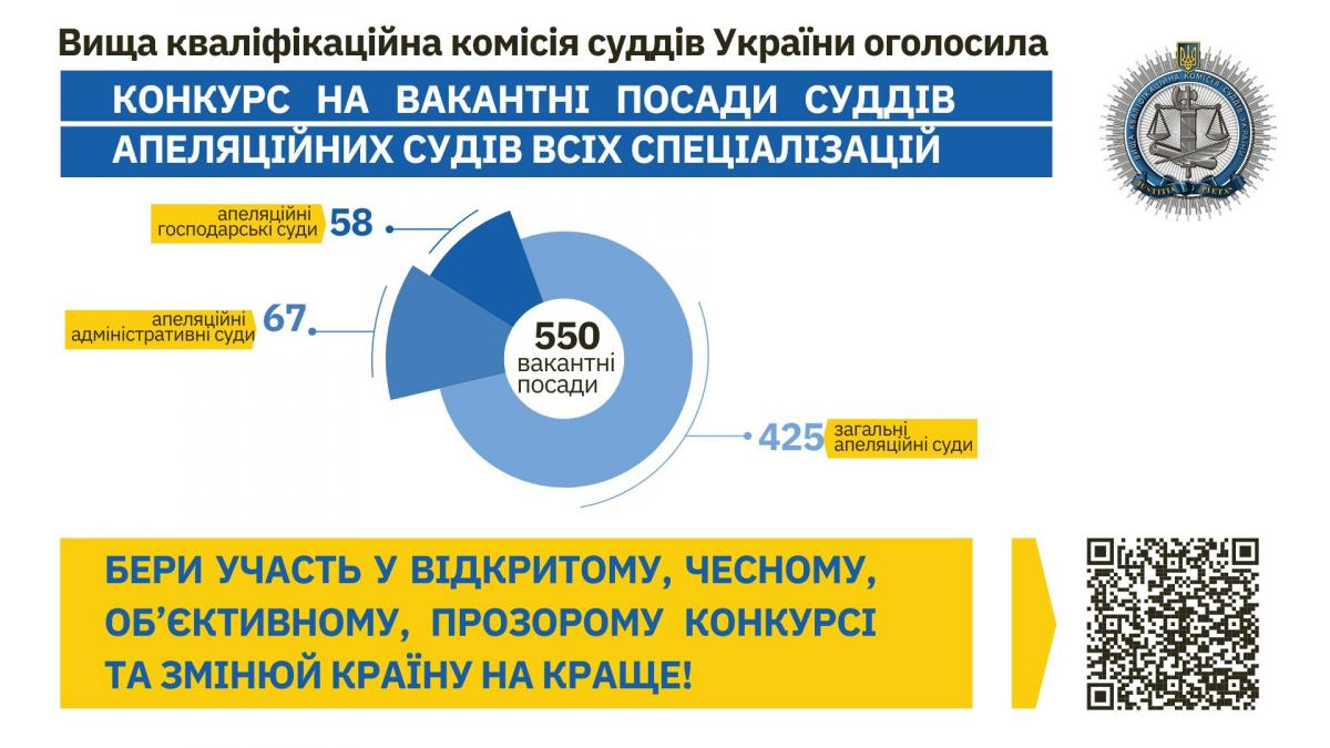 15 грудня 2023 року Вища кваліфікаційна комісія суддів України розпочинає безпрецедентний відкритий конкурс на заміщення 550 вакантних посад суддів апеляційної інстанції.