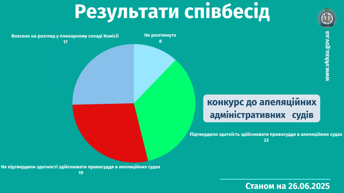 Загалом проведено співбесіди з 59 кандидатами: 23 кандидати підтвердили здатність здійснювати правосуддя в апеляційному адміністративному суді, 19 кандидатів – не підтвердили, з 17 кандидатами співбесіди відбудуться у пленарному складі Комісії.